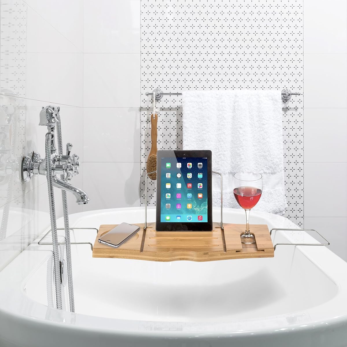 Bathtub caddy tray for luxury bath bamboo adjustable tray with book and wine holder, one or two person bath tray with extending sides for any bathtub (black) 6. Bambusi bathtub caddy tray with extending sides, reading stand, wine holder and cellphone tray. Cheviot products deluxe solid brass bathtub caddy, chrome by cheviot products. The adjustable tub caddy can be fit to a clawfoot or freestanding tub, and the edges feature rubber stops to prevent scratching of your tub. Pair with the optional deluxe reading rack for a most relaxing bathing experience.